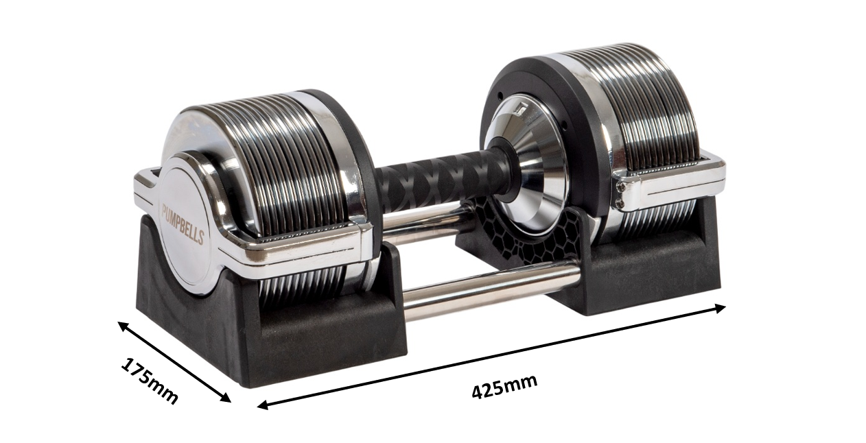 De dumbbell is 175mm breed en 425mm lang. De schijven zijn gemaakt van metaal en het mechanisme dat in de dumbbell zit wordt goed beschermd door een sterke behuizing.